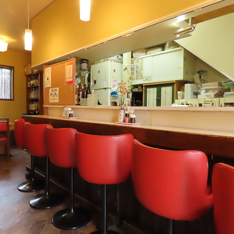 カウンター席は、料理をじっくり楽しむのにぴったり。赤い椅子が印象的で、居心地の良さを感じさせます。オープンキッチンからは、料理の様子を見ながら、温かい料理を味わえる特別な体験ができます。