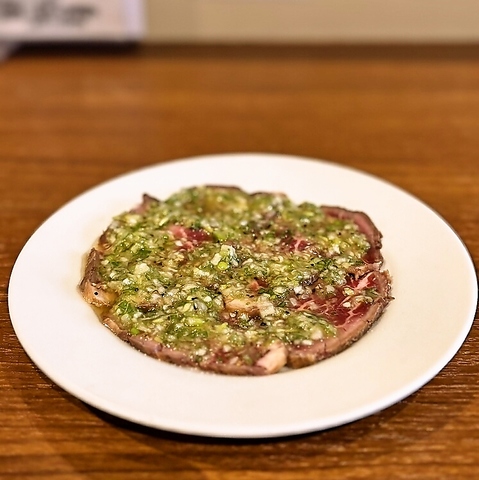 薄くスライスされた新鮮な牛サガリが、カルパッチョとして華やかに登場。肉の柔らかさとさっぱりとしたこだわりのソースが絶妙に調和し、一口ごとに新しい発見があります!