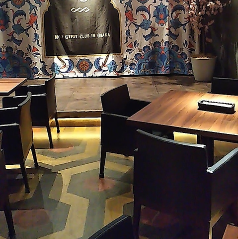 4人掛けや2人掛けのテーブル席を複数ご用意しており、グループやカップルでのご利用に最適です。トルコランプの柔らかな光が心地よい空間で、お食事や会話をゆっくりお楽しみいただけます。