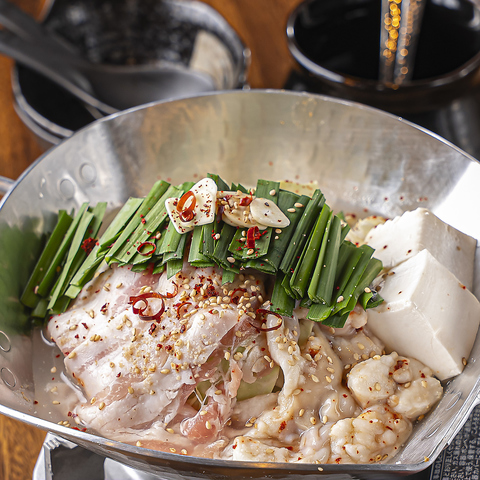 当店のもつ鍋は、1階の焼肉屋で使用している高品質なお肉をふんだんに使用!人気店の味をリーズナブルに楽しめるのが魅力です。飲み放題付きで、ボリューム満点!牛骨やA5ランクの牛筋から取った出汁が、濃厚な旨味を引き出します。しょうゆベースのスープが、もつと絶妙に絡みます!心ゆくまでご堪能ください。