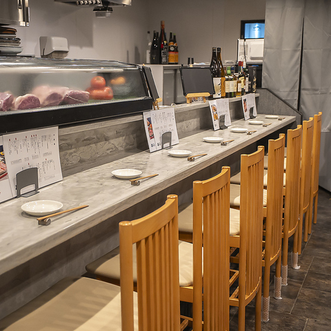 白を基調にしたシンプルで洗練された店内には、7席のカウンターがあります。木の温もりが感じられる座席に、目の前で料理が楽しめる特別な空間が広がります。一次会、二次会と、幅広い用途でご利用いただけるので、友人や同僚とのひとときにぴったり。リラックスした雰囲気の中、心温まるサービスでお待ちしております。