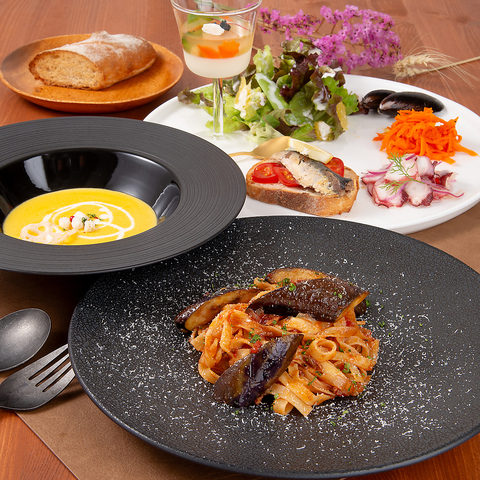 サラダと前菜の盛り合わせ/スープ/パン(森のパン工房さんの全粒粉パン)/パスタ(2種類からお選びください)大盛は+300円(税込)/メイン(お肉やお魚を使った創作料理)/ミニデザート/食後のコーヒーor紅茶(コーヒー紅茶はデカフェに変更もできます)