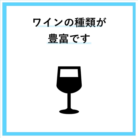 ワインの種類が豊富に揃っており、選りすぐりのワインをご用意しております。お料理に合わせて楽しめる多彩なラインアップを存分にお楽しみください。