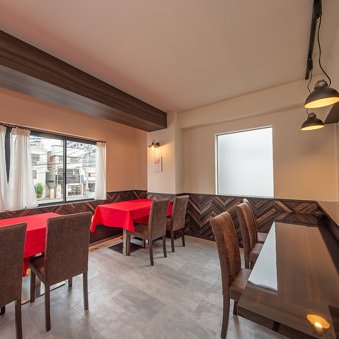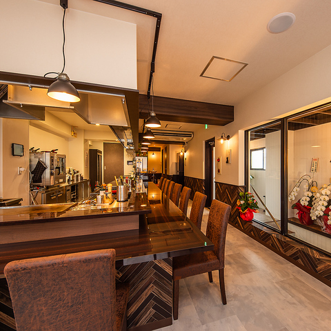 ダークブラウンのテーブルとイスで統一された店内は、しっとりと落ち着いた雰囲気♪暖色のダウンライトが照らすカウンター席はデートや女子会などにおすすめで、特別な時間をお過ごしいただけます♪店内奥の解放感が感じられるテーブル席では、ご友人やご家族連れなど仲間内でお楽しみいただけます♪