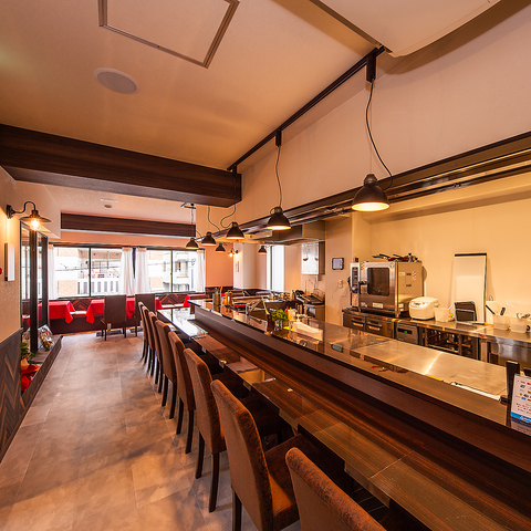 落ち着いたレストランのような雰囲気の店内♪カウンター席とテーブル席をご用意しており、おひとり様でのお食事はもちろん、デートや飲み会、ご家族でのお食事など、幅広いシーンでご利用いただいております!昼と夜で異なる魅力もお楽しみください♪