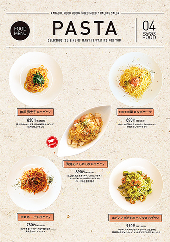 【和風明太子スパゲティ・モコモコ風カルボナーラ・海鮮とにんにくのスパゲティ・ボロネーゼスパゲティ・エビとアボカドのバジルスパゲティ】洋食屋さんのパスタのように美味しいパスタもご用意しております。