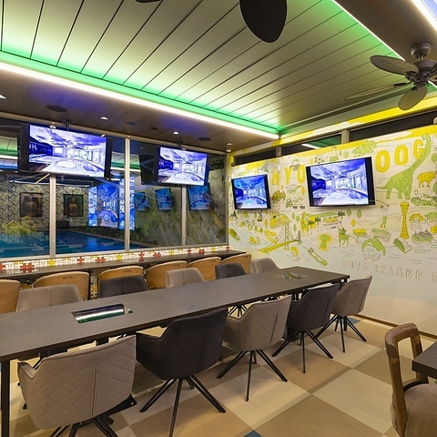 【どなたでも楽しめる特別な空間♪】プールを眺めながらお食事を楽しんでいただけるお店となっております。内観も天井、壁、床、扉等、全て建築のイチから携わっているからこそできるオシャレでユニークな形になっており、どなたでも訪れる度に心躍るような空間です☆