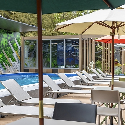 プールビューの解放感たっぷりのレストラン!ごはんをゆっくり食べるのもよし、子どもはプールで遊ぶのもよし、エンタメ空間で過ごすのもよし。家族みんなで好きな時間を過ごせます。