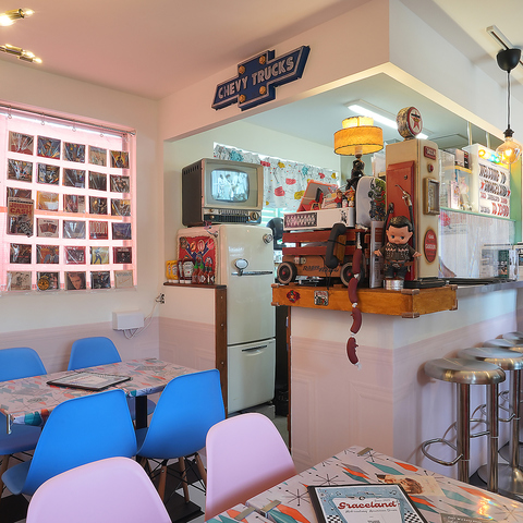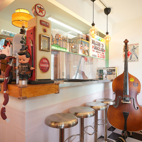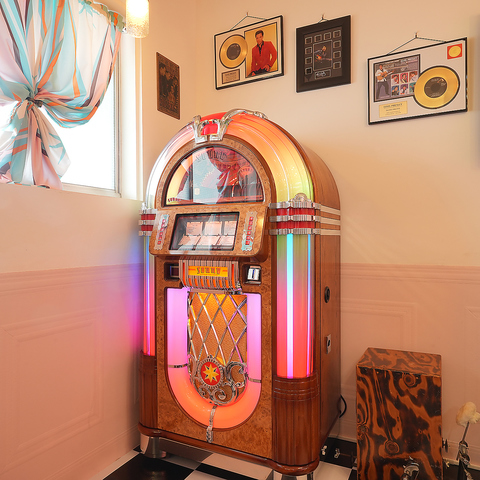 ビンテージの小物や、かわいらしいデザインをあしらったテーブル・イス、ジュークボックスが目を引きます◎