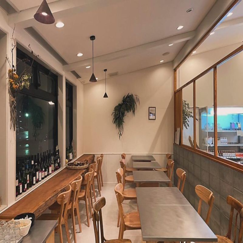 緑の植物がアクセントとなり、シンプルでありながら温かみのある空間になっております。昼間は大きな窓から自然光が差し込み、夜は柔らかな照明が心地よい空間を演出します。壁際のカウンター席には美しく並べられたワインボトルがあり、視覚的なアクセントになっています。