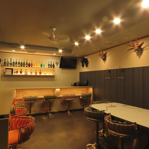 落ち着いた色合いで統一されており、スタイリッシュな雰囲気が漂います。バーカウンターには多彩なアルコールが並び、シックな椅子が訪れる人々を迎え入れます。心地よい照明が、リラックスした空間を演出しています。