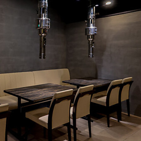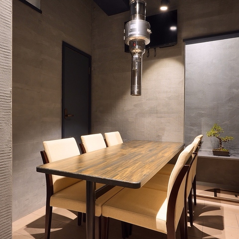洗練されたシックな雰囲気が広がる和のコンセプトの店内。強力なダクト設備により、においが付く心配もなく快適にお楽しみいただけます。個室は最大6名様までご利用可能で、プライベートな集まりや会食に最適です。喫煙スペースも完備されていますので、どなたでも快適にご利用いただけます。