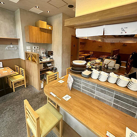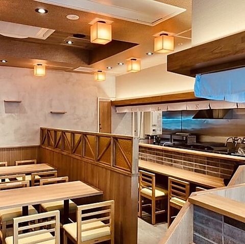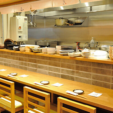 【落ち着いた雰囲気のカウンター席】おひとり様でふらっとお立ち寄りの際や、大人の居酒屋デートにぴったりのカウンター席をご用意しております。調理風景を楽しみながら、のんびりとお過ごしいただける粋な特等席です♪木の温もりを感じさせる明るくリラックスできる印象のお席で、日頃の疲れを癒せます◎お気軽にどうぞ!