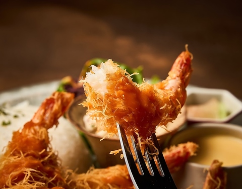 カダイフをまとわせて揚げたエビフライ。アメリケーヌソースでお召し上がりください。