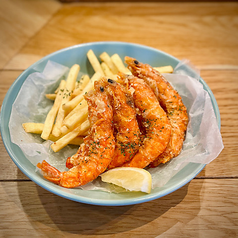 ハワイの人気料理。当店では頭から殻ごと食べられるソフトシェルシュリンプでご提供します。フライドポテト添え。