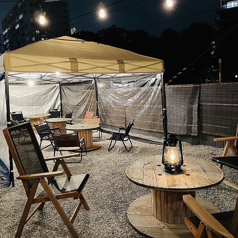 夜風が心地よいテラス「uraniwa」は、木製テーブルとランタンが灯る温かな空間。キャンプ気分でゆったりと食事やお酒を楽しめる、開放感たっぷりの特別席です。※Uraniwaは一心とは別メニュー、別会計になります。