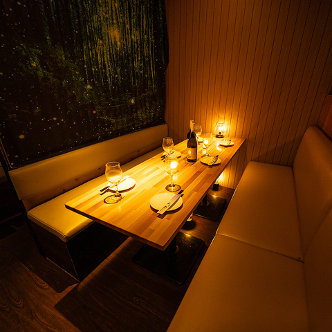 2名様から利用できる完全個室を完備。間接照明と木の温もりに包まれたモダンな空間は、デートや女子会、接待にも最適。落ち着いた雰囲気で会話と料理を楽しめる人気席。マイクやプロジェクターも完備しており、宴会や会食にも幅広く対応可能。
