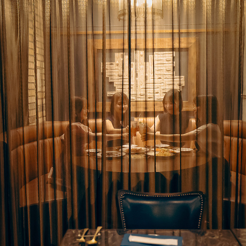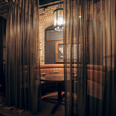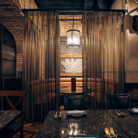 【半個室で優雅なひととき】カーテンで仕切られた落ち着きある半個室は、4~6名様でゆったり寛げるラウンド型ソファ席。アンティーク調のインテリアと柔らかな灯りがプライベート感を演出し、記念日や誕生日、女子会など大切なひとときに最適。周囲を気にせず会話も弾む、特別な時間をお過ごしください。