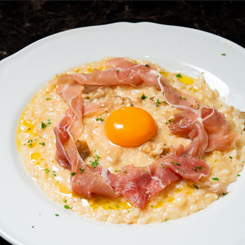芳醇なポルチーニの香りが広がる濃厚クリームリゾットに、生ハムの塩気と卵黄のまろやかさをプラス。とろけるコクと旨みが重なり合う、まさに贅沢の三重奏。口に入れた瞬間、幸せがほどけるごちそうリゾットです。シェアも良し、独り占めもまた幸せ。