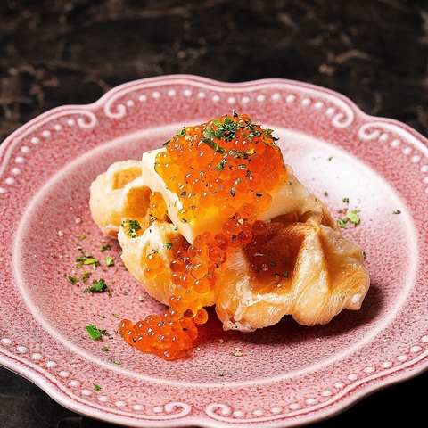 悪魔的なビジュアルと背徳感で話題沸騰!バター香るクロッフルに濃厚チーズをのせ、いくらをこれでもかと贅沢にトッピング。甘じょっぱさと旨みの洪水に、思わず笑みがこぼれる“痛風級”のご褒美メニュー。映えも味も満点の罪深い一皿です。