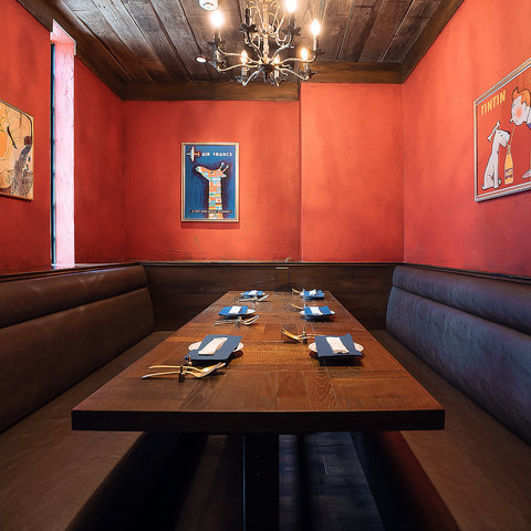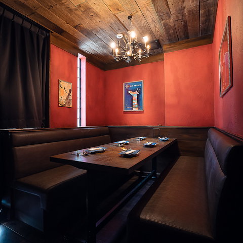 【完全個室で贅沢宴会】落ち着いたブラウンソファと赤壁が調和する上質な空間。温かな照明に包まれた完全個室は、4~8名様の女子会や歓送迎会、貸切宴会にぴったり。飲み放題付きプランも充実しており、特別な時間をゆったりと楽しめるプライベート空間です。