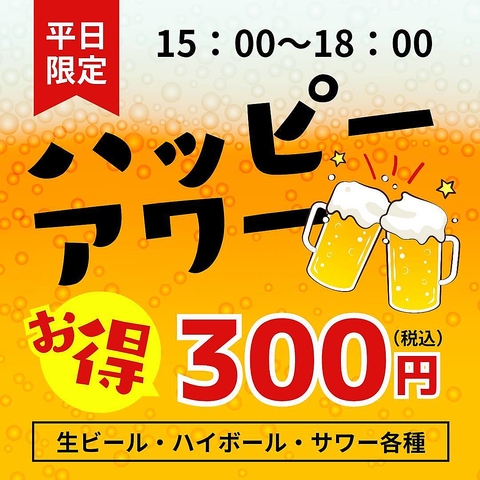 【平日15:00~18:00】にて大変お得なハッピーアワー開催中◎早い時間からママ友会や女子会などにピッタリ◎