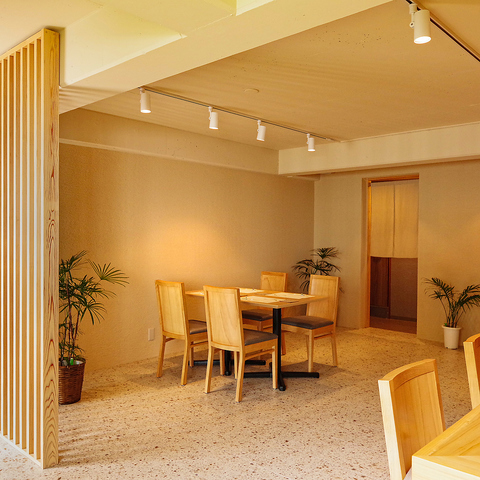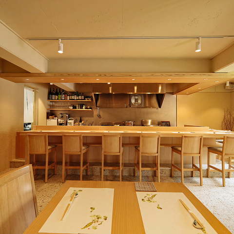 木を基調とした落ち着いた雰囲気の店内は、広々とした空間が広がります。カウンター8席と4名様テーブル1席を完備。落ち着いた大人の隠れ家空間は、記念日や接待など大事な方とのお食事にも最適。貸切利用も可能ですので、お気軽にご相談くださいませ。