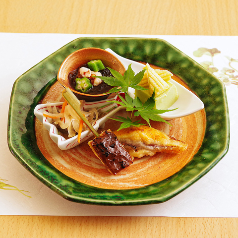 (白えびせんべい/もずく酢/よもぎ麩てり煮/蛤わらび焼)