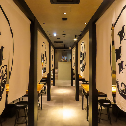 当店は店内の細部までこだわった内装となっております。入口を入った瞬間、目に飛び込んでくるインパクト大の「大提灯」、テーブル席全席に掛かっている「波千鳥柄の暖簾」など可愛いポイントが多数存在しております♪ぜひ一度ご来店して探してみてください!