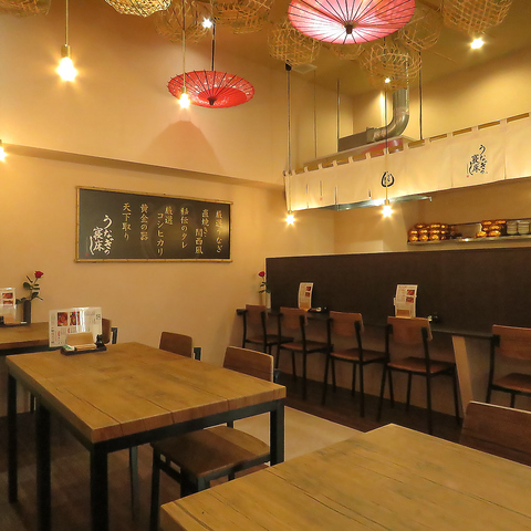 温かみのある照明とシンプルなインテリアが魅力的な雰囲気を醸し出しています。おしゃれな傘の装飾が空間に華やかさを添え、特別なひとときを演出。友人や家族との大切な時間を過ごすのにぴったりな場所です。