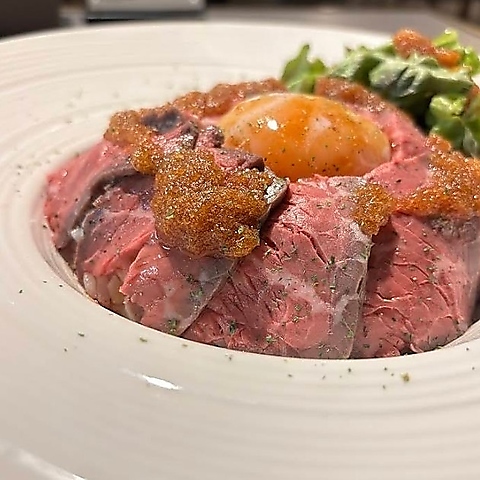 しっとりやわらかなローストビーフを贅沢に盛り付け、自家製のオニオンソースで風味豊かに仕上げた一杯!玉ねぎの甘みとコクが肉の旨味を引き立て、最後の一口までやみつきに♪ガッツリ食べたいときにもおすすめ◎
