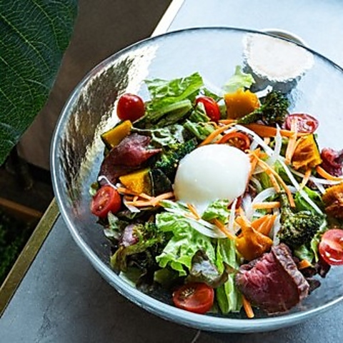しっとりやわらかなローストビーフをたっぷりトッピング!シャキシャキ野菜と特製ドレッシングが絶妙にマッチし、ヘルシーなのにしっかり満足感♪女性にも人気の、おしゃれで栄養バランス抜群の一皿です◎
