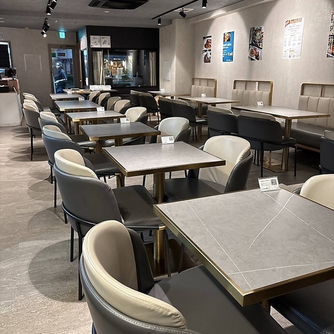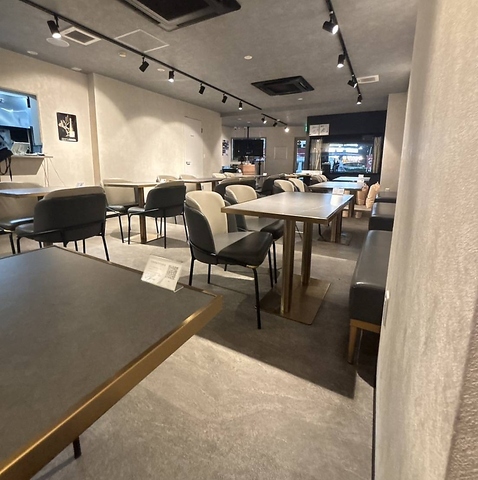 【落ち着いたモダン空間で、ゆったりとしたひとときを】グレーとゴールドを基調とした洗練されたインテリアが特徴の店内は、落ち着きと高級感を兼ね備えた上質な空間。テーブルや椅子の配置にもゆとりがあり、プライベートな会話も楽しめる設計です。カフェタイムやディナー、女子会など、シーンを問わずご利用頂けます♪