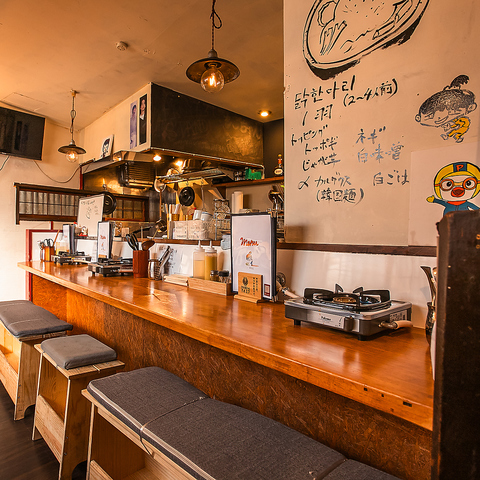 1階にはカウンター席があり、お一人様でも気軽に立ち寄れるつくりになっています。奥行きのある造りで、目の前で料理の準備風景が見られるのも楽しみのひとつ。照明は明るすぎず落ち着いたトーンで、静かに食事を楽しみたいときにもぴったり。タッカンマリやキンパをつまみに、韓国酒を一杯…という使い方もおすすめです。
