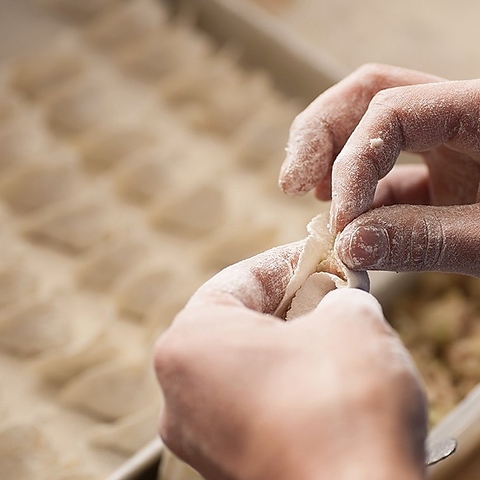 おしゃれな空間で楽しむ、特製の一口餃子。熱々の鉄板に乗せられて登場し、目の前でじゅうじゅうと焼ける音が食欲をそそります。パリッとした羽根と、モチモチの生地で楽しい食感♪ 新たなごちそうを、ぜひ体験してみてください◎
