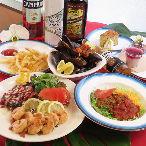 ランチはタコライスやガーリックシュリンプなど、充実したラインナップをご用意!ボリューム満点で、食欲をそそる美味しさが特徴です。お食事を楽しんだ後は、デザートにはスイーツをご用意しており、甘いひとときをお楽しみいただけます。またノンアルコールカクテルも豊富に取り揃えており、至福の時間を演出いたします。