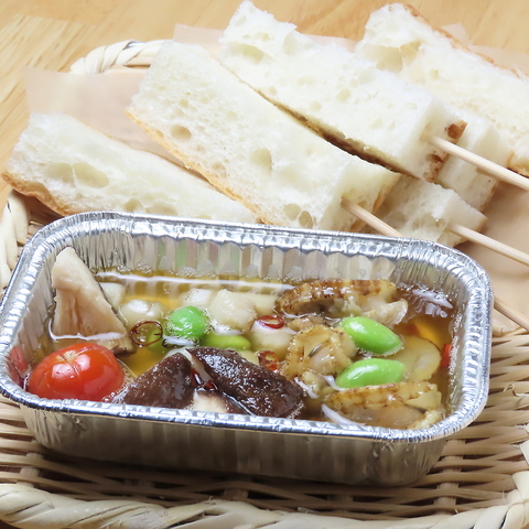 自信を持っておすすめする「アヒージョ」は、アツアツの状態で提供され、常にアツアツで楽しめます。バターの香りが漂い、食欲をそそりますよ。添えられた焼きたてのバケットと一緒にお楽しみください。素材の旨味が引き立つこの一品は、まさに贅沢そのもの。