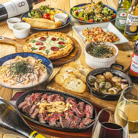 宴会やパーティーに最適なボリューム満点ハラミステーキが楽しめる120分飲み放題付きのパーティーコースを5000円(税込)で♪人気の若鶏の唐揚げや海鮮アヒージョ、明太クリームパスタなど全8品が楽しめます!女子会や誕生日、デートなど特別なひとときにもぴったり!貸切やサプライズもご相談を承ります。