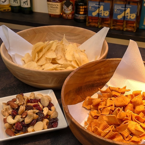 お酒のつまみにぴったりのナッツ類やチョコレート、ビーフジャーキー、たらなどを常時用意しております♪また、フードデリバリーにておなか一杯になれる料理の取り寄せも可能!