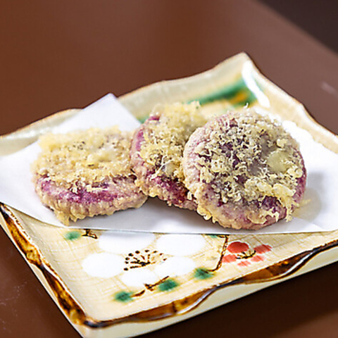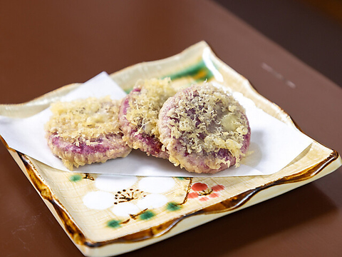 紅芋を使った沖縄の名物料理「うむくじ天ぷら」。独特の食感が特徴的で、老若男女問わず食べやすい逸品です◎