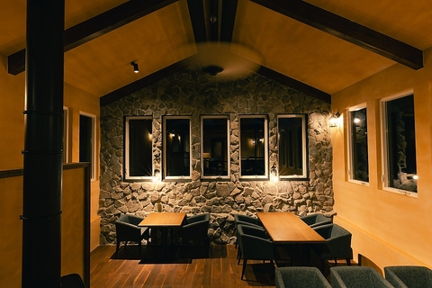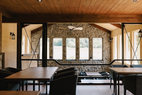 石積みの壁と温かみのある木材を使用し、自然をモチーフにした内装です。全28席のテーブルからは、大きな窓越しに富良野の四季折々の表情を楽しめます。まるで風景画のような美しい景色を眺めながら、五感で四季を感じるひとときをお過ごしください。