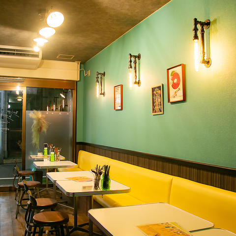 【各種ご宴会・記念日・サプライズにもおすすめ!】ブルーグリーンとパステルイエロー、ダイナーテーブルのコンビネーションがおしゃれなアメリカンダイナー空間☆記憶に残る記念日サプライズのお手伝いも♪花火付きのバナナボートでお祝い♪メッセージプレートは1,500円~ご用意いたします◎