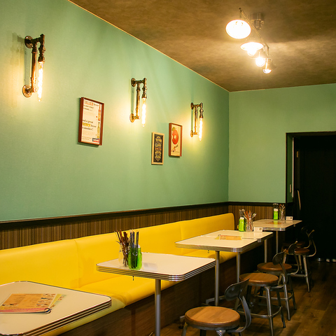 【各種ご宴会・記念日・サプライズにもおすすめ!】ブルーグリーンとパステルイエロー、ダイナーテーブルのコンビネーションがおしゃれなアメリカンダイナー空間☆記憶に残る記念日サプライズのお手伝いも♪花火付きのバナナボートでお祝い♪メッセージプレートは1,500円~ご用意いたします◎