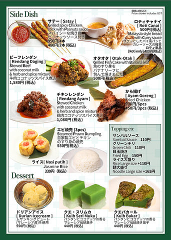 代表的なマレーシア料理をご用意しています。サテーやデザートのクエをお楽しみください。