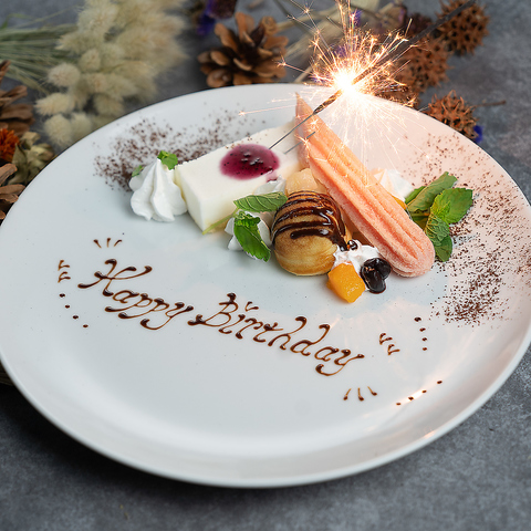 誕生日や記念日など、大切なひとときを彩るサプライズもご用意いたします。歓送迎会向けのプレートもご用意