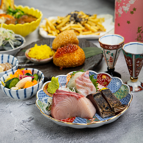 旬の食材を取り入れた和食を中心に、酒に寄り添う料理をご用意しております。市場直送の鮮魚を使った刺身や、丁寧に仕立てた温菜、香ばしく焼き上げた逸品まで、季節の味覚を楽しめる一皿を揃えました。料理に合わせて楽しめる日本酒や焼酎をはじめ、ワインやハイボールなどお酒の種類も豊富に取り揃え。