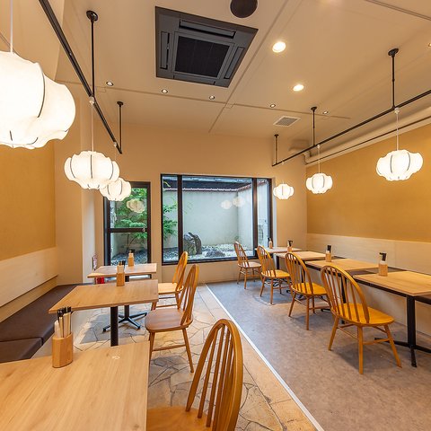 【お店の雰囲気】優しい木の温もりと和の趣が調和した、心落ち着く空間。窓の外には小さな庭もあり、ゆったりとしたひとときを演出♪ランチはラーメン、夜はもつ鍋でが楽しめます。