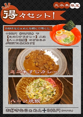 - ※トッピング・追い飯・替え玉・和え玉は、らぁめん、まぜそばを頼んで頂いた方のみのご注文になります。※らぁめん、まぜそばの大盛りのご用意はありません。