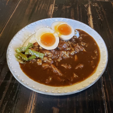 当店自慢の味たま牛すじカレーは、柔らかい牛すじとこだわりのスパイスが融合した贅沢な逸品!コク深い味わいをぜひお楽しみください♪じっくり煮込んだ自家製牛すじカレーにらぁめんトッピングの定番半熟味玉を乗せました!ミニサラダ付きで栄養もバッチリです!