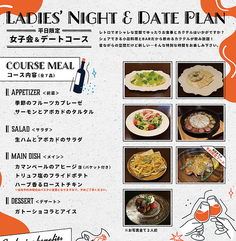 月ー木の平日限定で頼めるコース料理も大好評!BARだから実現した種類豊富なカクテルがなんと飲み放題!